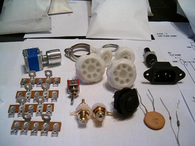Dijelovi mehanike - ovdje nedostaju samo konektori za zvučnike zbog kojih isporuka i kasni par dana, nadam se (:-), kao i ono što se ne vidi - univerzalna pločica na koju se montira ispravljač. Tu su prekidači 4-8 ohm i mrežni, blok za prekidač (iskrište), dioda i predotpor za led indikaciju (napon uzimamo sa grijača lampi) ...