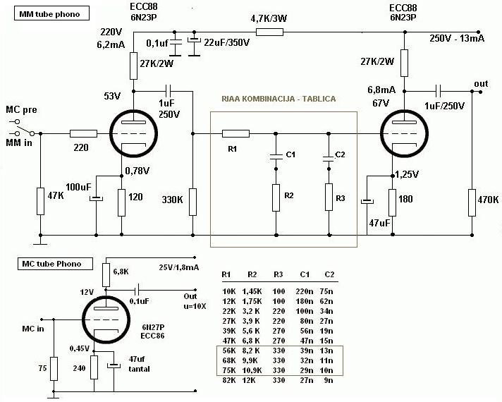Za RIAA kombinaciju sam stavio tablicu, točne vrijednosti treba postići serijski-paralelnim spajanjima, i kako