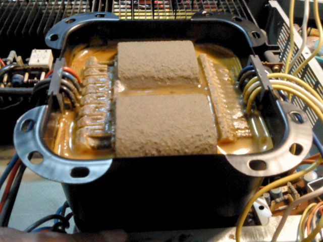 Transformator je oklopljen kutijom, cije je dno zapravo duplo dno kutije, koje je ujedno i nosac i ojacanje radi povecane tezine. Skidanje trafoa pokazuje o cemu je zapravo rijec - radi se o vrlo kompaktnom trafou s duplom C jezgrom, posve zalivenom. Lijevi i desni trafo se unekoliko razlikuju - svaki ima po jedan sekundar s srednjim izvodom za napajanje izlaznog stupnja pojacala, desni uz to ima dodatni sekundar za napajanje zastite i VU-metra, a lijevi dodatni sekundar s srednjim izvodom za odvojeno napajanje svih predstupnjeva za oba kanala pojacala. U tom smislu pojacalo nije striktno dual-mono, no izlazni stupnjevi su posve neovisni, sto je uz stabilizirana napajanja za predstupnjeve vise nego dobar kompromis - za neku sitnu ustedu performanse su prakticki iste: