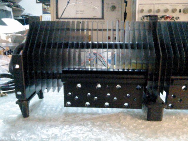 Oba pojacala i izlazni moduli na hladilu skidaju se iz kutije u jednom komadu, nakon odspajanja izlaznih klema za zvucnike i male plocice s ulaznim cinchevima... a tu je i prekidac za prebacivanje pojacala u mosni spoj, pri cemu izlazna snaga raste na oko 200W. U stvarnosti su ljudi izmjerili znatno vise u oba moda rada, sto nije cudno s obzirom na ozbiljnost napajacke sekcije... Pogled na pojacalo odozgora:
