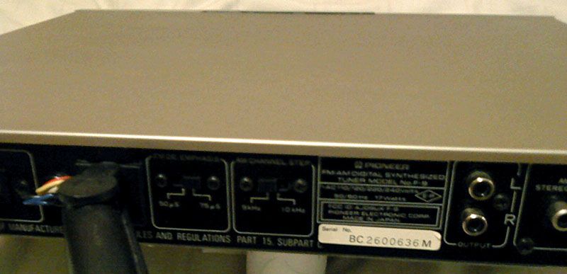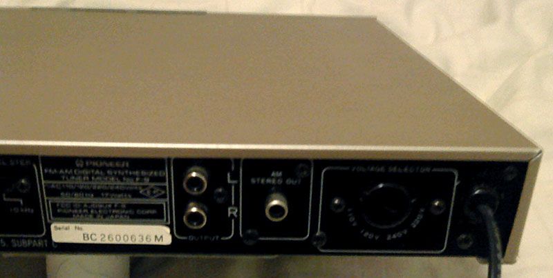 Straznja ploca nema nekih ekstravagancija iako je zgodno za znati da je velika vecina F-9 sposobna raditi prakticno bilo gdje na svijetu, osim u Japanu gdje je opseg frekvencija za FM drugaciji (postoji posebna japanska verzija). Napon napajanja se moze birati, kao i deemphasis za FM, te raster AM kanala. Iako je vecina konkurenata u svojoj vrhunskoj kategoriji nudila FM-only tunere, Pioneer je u ovaj uredjaj ugradio prilicno sofisticirani AM prijemnik, s baseband izlazom za eksterni AM stereo dekoder. Inace, taj standard se samo uidomacio u USA gdje je ogroman broj radio stanica rezultirao maksimalno naguranim FM bandom, te je i AM stereo postao zanimljiv:
