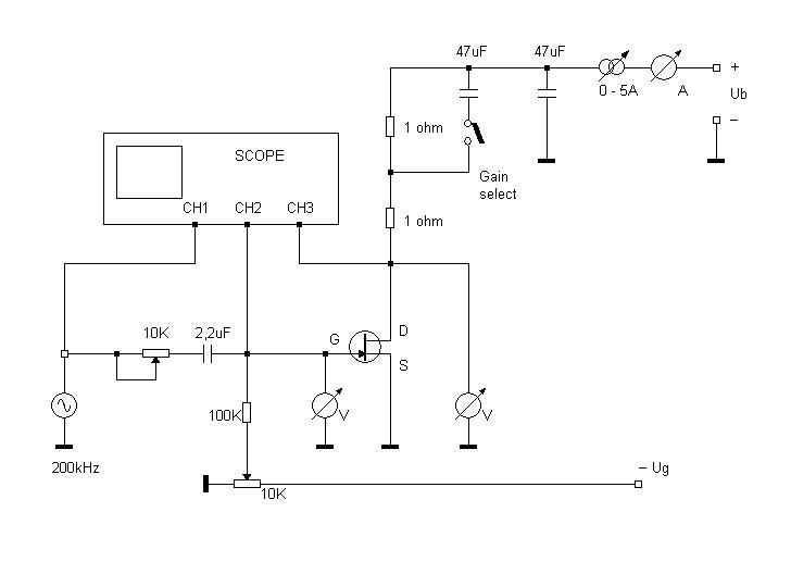 Variranjem biasa i struje kroz CCS postavljamo Vfet u predvidjenu "trenutnu" radnu tocku tako da vridnosti Id i Uds budu upravo one koje ce u stvarnom sklopu bit postavljene trenutnom vridnosti ulaznog signala. Sa signalom relativno visoke frekvencije (recimo 200kHz) i cim manje amplitude vrsimo mjerenje ulaznog kapaciteta ovakvog spoja sa zajednickim sourceom. A kako je taj sastavljen od Cgs i Millerovog kapaciteta onda ce tu ic i malo racunanja. Selektiranjem i mjerenjem pojacanja za obadvi vridnosti otpornika u drainu dobivaju se dvi jednadzbe sa dvi nepoznanice a iz njih se lako izracunaju Cgs i Cds u pretpostavljenoj radnoj tocki.