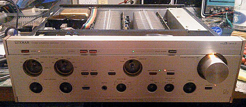 Zadnja ploca je rijesena prije toga. Srecom, najkompliciranija operacija, ona nad 'sajlom' za sklopku se pojednostavila tako da su zamjenjene strane sajle, cime je problematicna strana sajle dosla na mjesto gdje se sajla najmanje moze uvijati. Ispostavilo se da je plava vanjska plastika napravljena tako da se moze 'otrgnuti' bilo gdje (vjerojatno se proizvodi na metar) sto se i dogodilo. krajevi zato savrseno pasu jedan u drugi, trebalo je samo osigurati da i ostanu tako. Tu je posao odradilo malo otapanja plastike, malo ljepila i termobuzir. Etro svega skupa sklopljenog, s izuzetkom gumbiju. Izlazni stupnjevi jos nisu pod napajanjem, ovdje se samo vidi faza 'generalna proba' s provjerom da svi prekidaci stimaju, svi LED rade, zastita radi kako treba. Vec je bilo poprilicno kasno, pa sam odlucio finalno pustanje u pogon ostaviti za danas navecer, kad ce sive celije biti ipak malo svjezije.