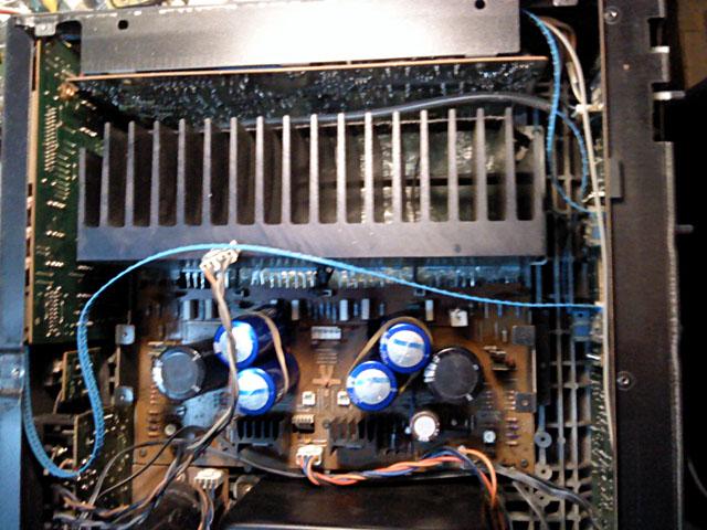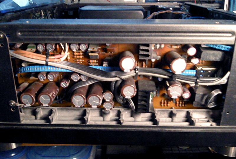 Na mjestu izmedju trafoa i zadnje ploce stoji dodatni par filterskih elektrolita, kojeg nema u mladjem bratu TA-F730ES...