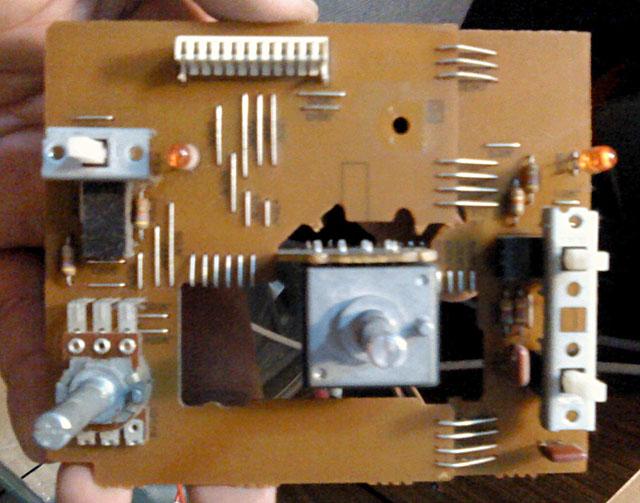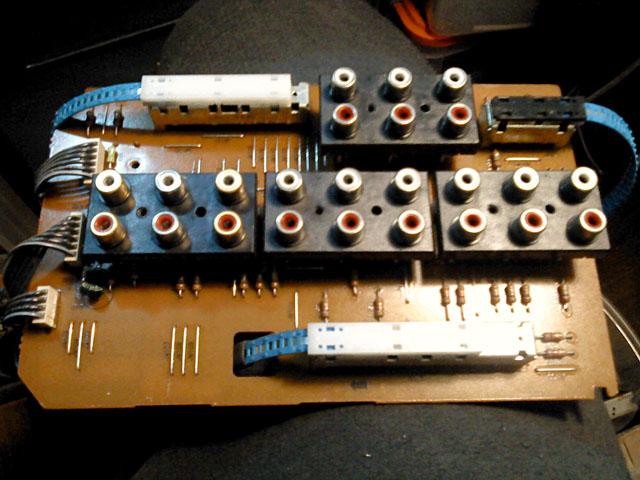 Posto je cijela prednja ploca tako konstruirana da se skida u komadu, nakon sto se odspoje konektori, i skinu sklopke 'na sajlu', nije zgorega poslikati sto je kamo islo. Plave plasticne trake u sebi kriju metalnu traku koja sluzi kao 'daljinsko upravljanje' za preklopnike koji su zapravo na zadnjoj strani, kod samih ulaznih konektora, te na phono sekciji: