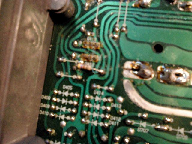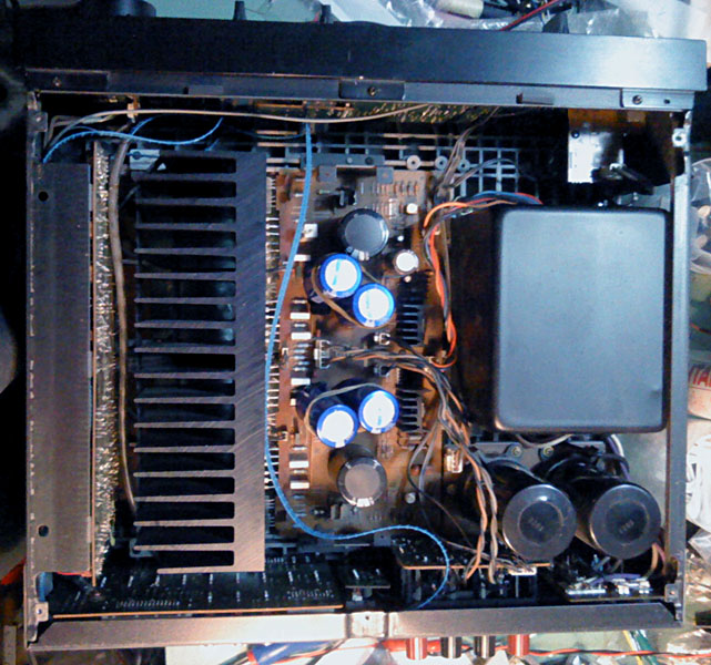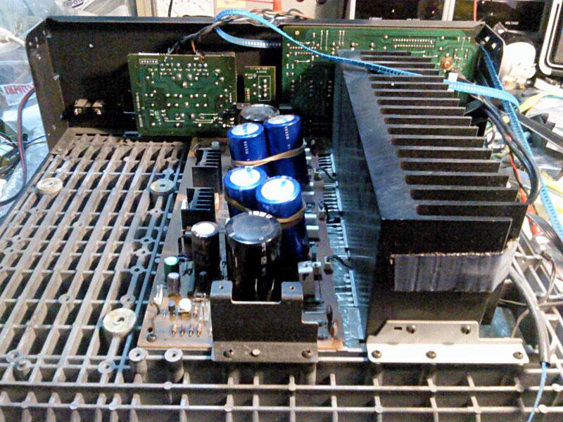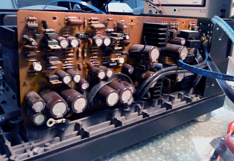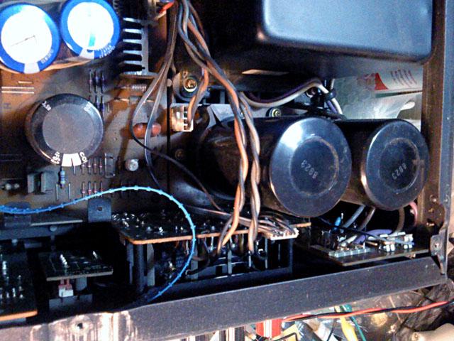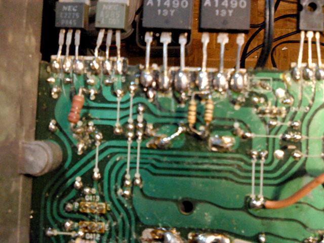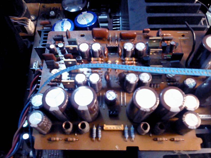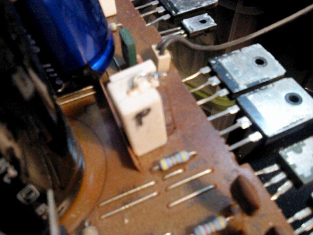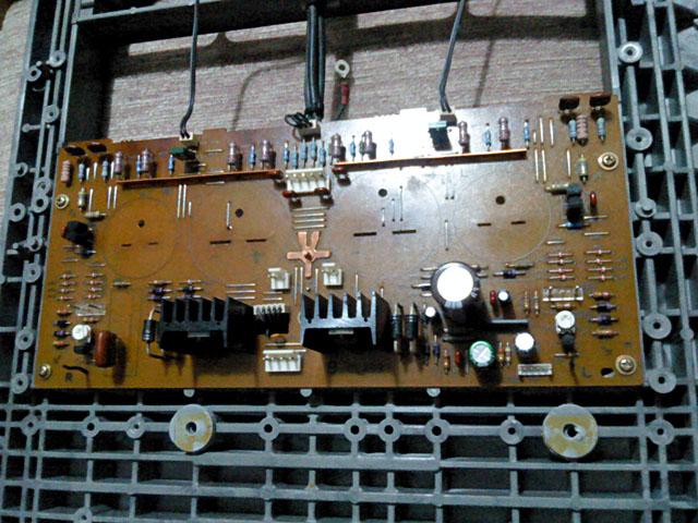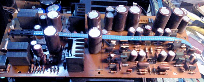 Na glavnoj ploci je bilo najvise posla, za pocetak su skinuti svi 'horrori', ali i cijeli set tranzistora, od bias serva do izlaza. Osim toga, maknuti su i 4.7 ohma bazni otpori za izlazne tranzistore, 0.22 ohma stack-foil emiterski otpori od kojih je jedan zamijenjen klasicnim 4W zicanim (onaj s napisanim P na sebi). Problem je sto se ispostavilo da jos jedan ima los mehanicki kontakt koji je vjerojatno prouzrocen kvarom u izlaznom stupnju. Uz to je zamijenjen i 'auzmesh' emiterskih otpora u driver i pre-driver stupnjevima, i naravno svi nadomjesni elektroliti i jumperi.