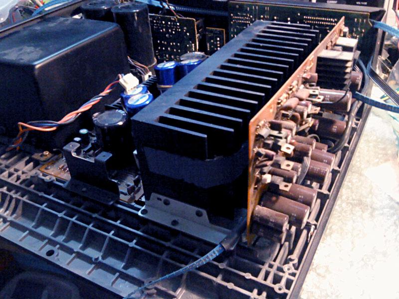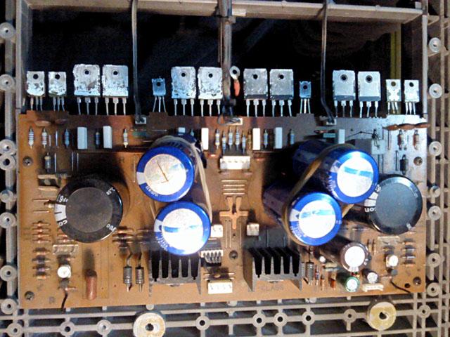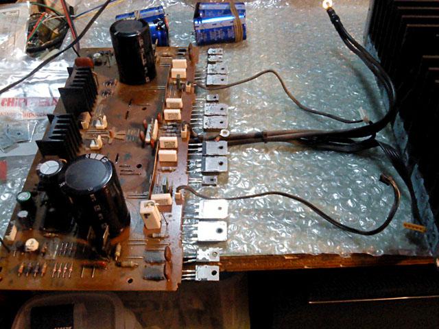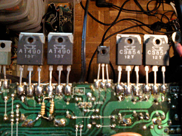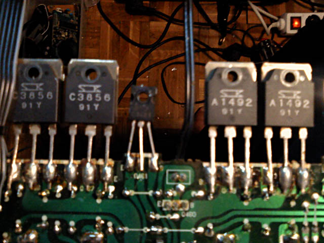 Izlazni tranzistori izgledaju originalno... ali samo izgledaju. Za pocetak, bilo bi dobro da su isti na oba kanala. Ovako, razlikuju se samo za kojih 30-ak V maksimalnog napona i 4A maksimalne struje. Ajde, bar su originalni Sanken... A zasto su uopce ti koji jesu? E pa samo su 3 puta sporiji od LAPT-ova koji su tu bili u orginalu, i koji su znacajno skuplji. Reverse tweak? Netko je ocigledno krao dijelove...