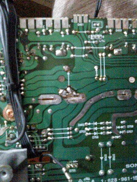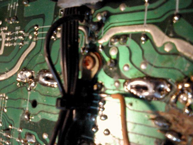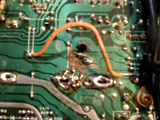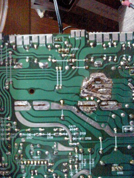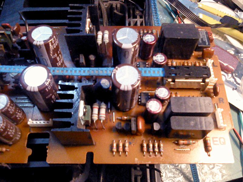 Skidanje kondenzatora koje je stavio 'majstor' pokazuje i razloge drugih problema - obratiti paznju na flomasterom napisane oznake za + i -, narocito na dvostruke, od kojih su jedne prekrizene, ispod jednog od kondenzatora. Ne treba ni reci da originale ne mozete krivo staviti, no zato nadomjesne... dovoljn je reci da se ispod ovog s krivim oznakama nalazi poveca havarija vodova na stampanoj ploci. Tu je prije stavljeno nesto drugo, sto je u toku umiranja pod krivim polaritetom napona, ispustilo luzinu i izmedju ostalog pojelo jumpere, koje je 'majstor' zamijenio bakrenim zicama, ne vodeci racuna da nije bas svejedno na kojis e dio voda tocno spajaju - na sto su tvorci pojacala itekako obratili paznju, kako bi stvorili lokalne zvijezde napajanja i mase.