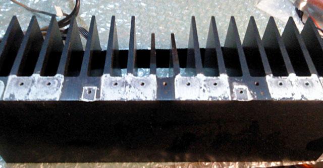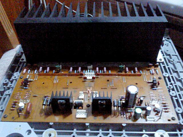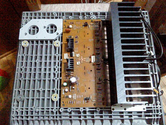 Od cijelog pojacala je ostala jos samo glavna ploca s hladilom, koja ide zadnja i na kojoj je najvise problema, te zadnja ploca, koja se skida u komadu, slicno kao i prednja: