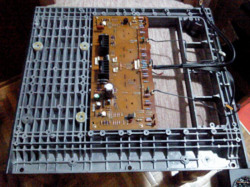 Skidanje zadnje ploce je jednostavno - 7 vijaka i sve skupa je dolje. jedini manji problem je tocka mase do koje idu mase glavne i bicne ploce. kao i uvijek, fotografiranje je odlicna stvar kada treba zapamtiti gdje je sto bilo, premda sama konstrukcija uredjaja prilikom sastavljanja uglavnom sve cini ociglednim: