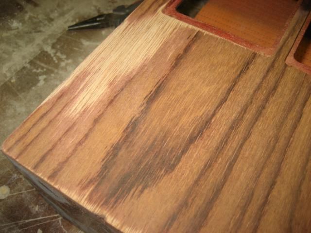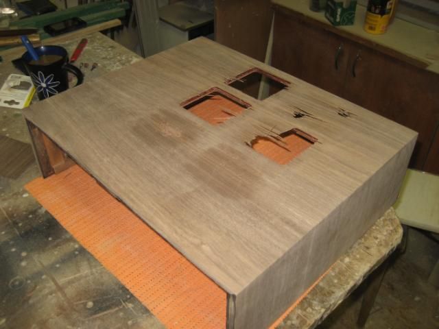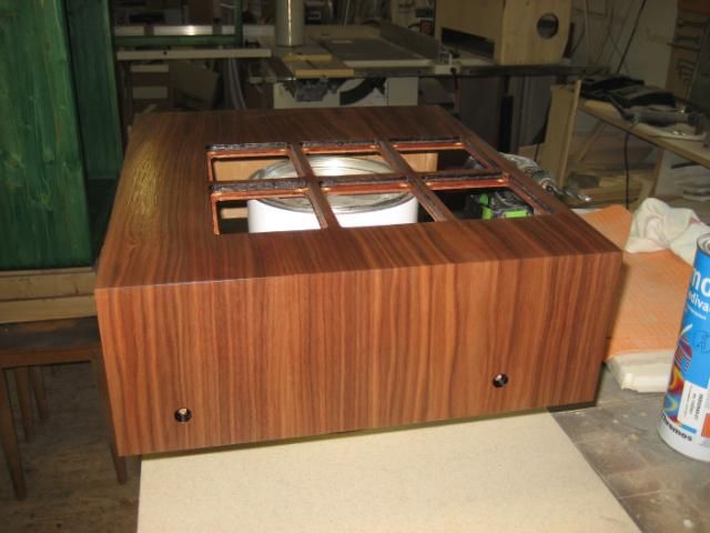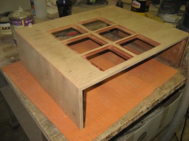 Nakon ljepljenja "američanskog" oraha, stavljen je "rubin" crveni bajc pomješan sa nitro razređivačem i utrljan krpicom u furnir. Nakon toga je lakirano 2 x temelj i tri ruke završnog polumata. Moglo je i manje, ali ovak ja više zaradim. :lol:
