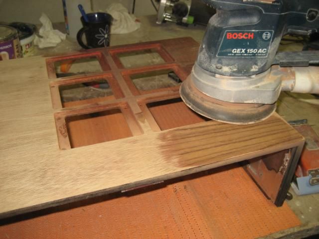 Prvo istrazivacko brusenje originalnog furnira. Osim sto je bio ostecen, netko je vec izveo nesto s nekakvim lakom... ispod njega i njegove crvenkaste boje je u originalu bilo nesto smedje, a ispod toga je sperploca od koje je izradjen poklopac.