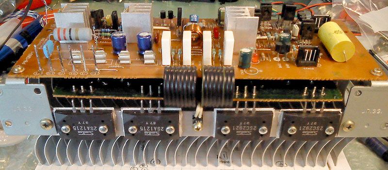 U medjuvremenu, zavrsen je posao na modulima izlaznih pojacala. Originalni NEC RET-ovi su zamjenjeni poznatim Sanken parovima 2SC2921/2SA1115. Malo teze je bilo nabaviti dvostruke diode za bias kompenzaciju, i spojne kablove izmedju modula i ploce nosaca tranzistora. Na slikama tranzistori jos nisu zalemljeni - napajanje je prilicno visokoh +-64V i svaka greska rezultira u saci spaljenih elemenata. Testiranje s originalnim napajanjem zato ne dolazi u obzir - umjesto toga, inicijalni test ce biti na stolu s laboratorijskim ispravljacima i limitiranom strujom, te bez izlaznih tranzistora. Umjesto njih ce, bez opterecenja, posluziti driveri, ciji ce izlaz biti premosten na izlaz pojacala. Tek kada modul prodje taj test, slijedi spajanje izlaznih tranzistora, te podesavanje offset-a i struje mirovanja, prije nego modul uopce bude ugradjen u pojacalo. Nakon toga slijedi test stabilsnoti struje mirovanja, i tek onda ugradnja: