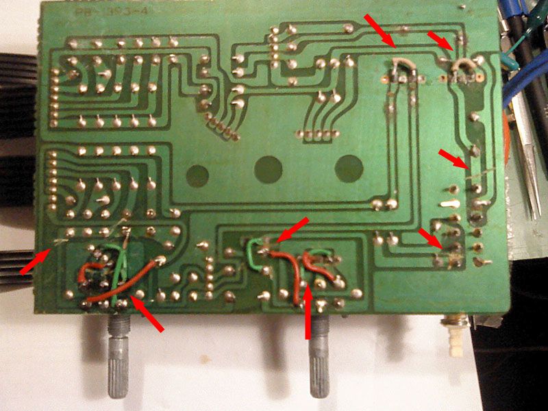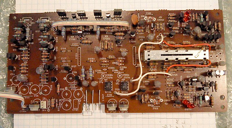Nakon svih tih preliminarnih poslova slijedi lemljenje ostalih dijelova. Elektroliti su Elna i Yageo, na zalost od 4 10nF stirofleksaprezivjela su 3, jednog je ipak napalo ljepilo. Srecom, dva su na izlazima regulatora napona (sto bi trebalo prilicno jasno docarati koje su bile ambicije konstruktora!), srecom na plocu su predvidjeli mjesto za drugaciji tip, tako da su tu legle WIMA folije. Slicna prica s bipolarnim elektrolitom u DC-servu, sve je zamijenjeno folijama WIMA i ERO. Svi stirofleksi su prelemljeni kako treba i provjereni, s obzirom da ih je dosta bilo nagnutih i s posavijanim izvodima. Kratkospojnik od 8-zilnog flat kabela se na pola raspao pa je stavljen novi, kratkospojnici su jos u prethodnom koraku urednije savinuti, potenciometri oprani i sredjeni kontakt spray-em.