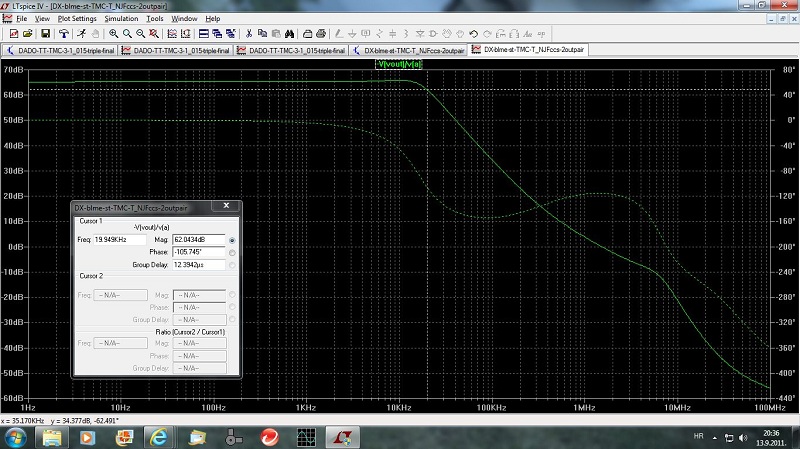 Evo jos malo objasnjenja. Ovdje je koristena TMC(Transitory Miller Compensatio) koji omogucava puno vecu negativnu povratnu vezu(LG - Loop Gain) kod 20kHz sto drasticno umanjuje izoblicenja izmedju 6-20kHz. Ovdje je koristeno i umanjenje pojacanja VASa(Voltage Amplifier Stage - Q7 i Q9) dodavanjem R24. Tako se dobije jednoliko pojacanje od 0Hz do 20kHz a C23 umanjuje vrsak pojacanja kod cca 15kHz i izravnava fazne promjene. Ovdje je LG digram iz kog se vidi da je vise od 60dB negativne povratne veze na raspolaganju ko 20kHz. Na taj nacin, teoretski ili simulirano, THD kod 20 iznosi oko 0,00005%. Prakticki je uvijek nesto vece i to dosta ovisi o izvedbi stampane plocice i napajanja.