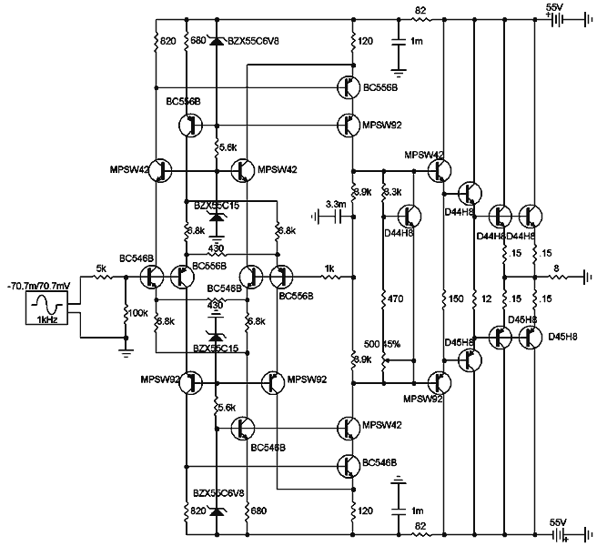 Tipovi tranzistora su odabrani prema onome sto je bilo za odabrati usimulatoru. U kaskodama ulaznog stupnja bi sasvim fino radili i obicni BC546/556, a drugdje gdje su stavljeni MPSW42/92, citaj MJE240/350. Bitno je reci da kaskoda na izlazu naponskog pojacala kao i cijeli izlaz zahtijevaju vrhunske tranzistore za maksimum perormansi, s njima bi se podosta jos dalo izvuci.