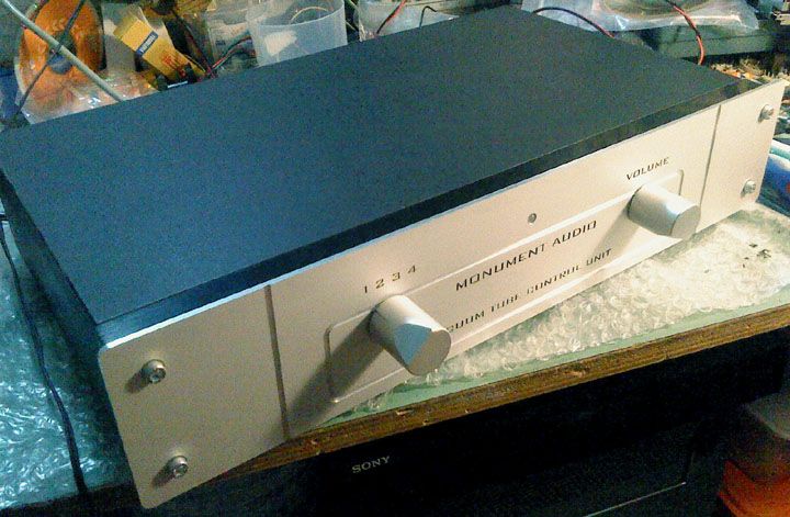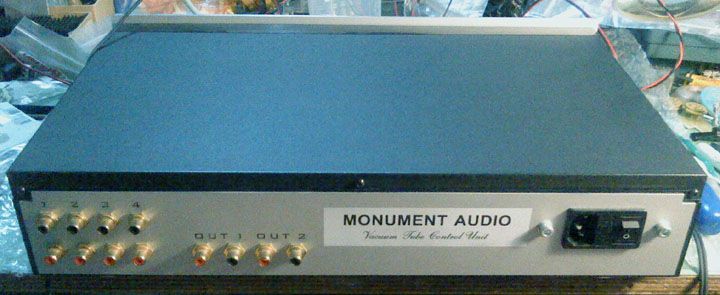 Preklapanje ulaznog signala je rijeseno relejima, tako da se moglo smjestiti na samom ulazu. Svaki ulaz ima paralelni otpornik oko 470k koji omogucava korektnu polarizaciju mozebitnih veznih kondenzatora u uredjajima spojenim na ulaze, jer je potenciometar spojen na ulaz tek kad je isti selektiran. Selekcija je izvedena s dvostrukim kontaktima tako da kapacitet otvorenog kontakta ne generira inace dosta dobro poznat problem probijanja tihih visokih tonova iz ulaza koji nije selektiran, pogotovo ako se selektira ulaz na koji nista nije spojeno. Na izlazu su takodjer muting releji koji kratko spajaju izlazne cincheve za vrijeme inicijalnog grijanja cijevi, kao i odmah po ispadu napajanja ili gasenju uredjaja, da se sprijeci udar u zvucnicima zaboravi li korisnik da najprije treba iskljuciti izlazno pojacalo. Ozicenje je povuceno kroz prednju plocu i ispod i sa strane aluminijskih nosaca plocice (koji su naravno uzemljeni):