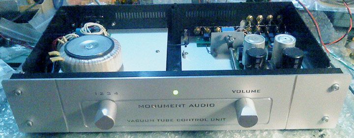 Radi se o jednostavnom Line stage-u s ruskom vojnom pentodom 12Z1L, spojenom u triodu (G2+G3+A zajedno za maksimalnu strminu). Evo pogleda 'pod haubu':