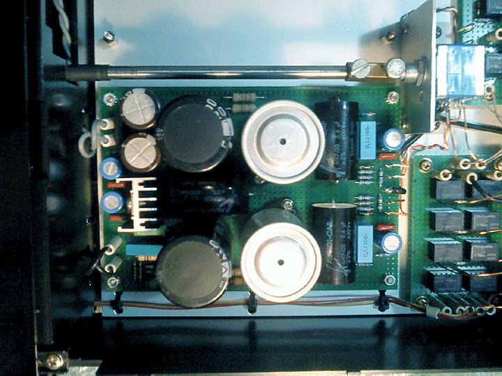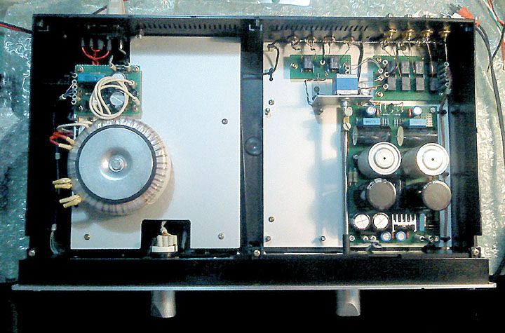 S lijeve strane je (jako predimenzionirani) transformator, i soft-start elektronika s ispravljacem za pogon releja za muting i selekciju ulaza. S desne strane odozgora si redom izlazni muting releji, potenciometar glasnoce, releji za selekciju ulaza, i u donjem desnom kutu ploca sa svim ostalim - ispravljacem za B+ cijevi s RCRCRC filtriranjem, ispravljac i stabilizator napona za grijanje i bias, i stereo line stage.