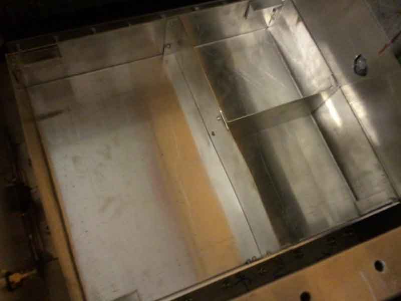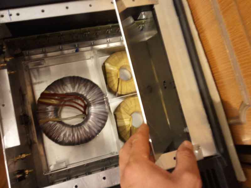 na gornju strane kutije dolazi perforirani lim koji bi trebao teoretski odrađivati ulogu Faradejevog kaveza i nakon toga dolazi poklopac od aluminijskog lima na koji sam pričvrstio elektroniku i ostale dijelove ispravljača . Kao što se vidi na slici ima tri odjeljka od kojih je veći za trafo a manji su za induktivitete.