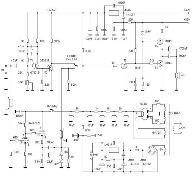 Izlazni Ge tranzistori koji su koristenu u shemi su Ruske proizvodnje iz 89godine, i koristeni su u vojnoj tehnici (radarskoj) u pitanju su GT813V (1T813B).