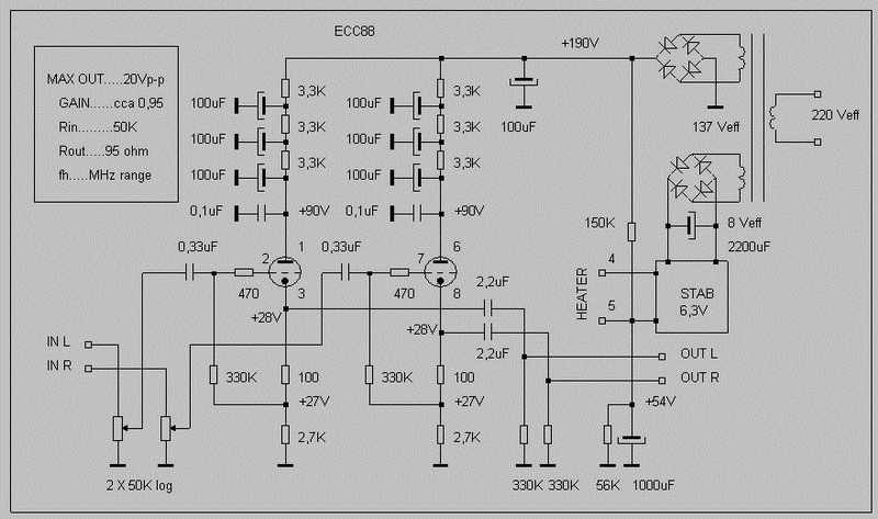 joe dalton je napisao/la:Oprosti, gledao sam shemu napamet pa sam pomislio da je jedna druga shema istog autora. Ta druga je isto sa ECC88, ali s izlazom sa anode i pojačanjem 2,5 puta. Koliko se sjećam izlaz je sa djelila pa bi se to pojačanje moglo i nešto povećati.