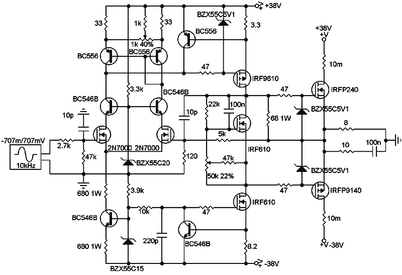 Otpori 10m ohma u drain-ovima IRFP-a su zapravo osiguraci, za rad na 8 ohma bi 2A brzi morali biti vise nego dovoljni. Struja mirovanja se mjeri na osiguracu IRFP240, i tot ako da se umjesto osiguraca stavi otpor 1 ohm, pa se mjeri za svaki mA struje mirovanja, na tom otporu 1mV. 'Magija' pocinje od struje mirovanja 100mA na dalje, ali u praksi je nepotrebno ici preko 150mA. Za primijetiti je da nema source otpora za izlazne MOSFET-e. Ovo je pojacalo optimizirano za rad bez njih i konsekventno, moze raditi samo s jednim parom MOSFET-a. Teoretski, moguce ih je spojiti vise u paralelu ali ih u tom slucaju treba pomno selektirati. Radi izmaka tocke preskoka, struje kroz izlaz u mirovanju nisu iste, struja je kroz IRFP9140 nesto veca, sto se ujedno koristi za kompenzaciju njegove nesto manje strmine u odnosu na IRFP240, za male struje (sto je bitno za optimizaciju izoblicenja na snagama do omko 1W). Radi te razlike uparivanje nije striktno potrebno ali je pozeljno, da se bas ne pogode totalno raspareni primjerci.