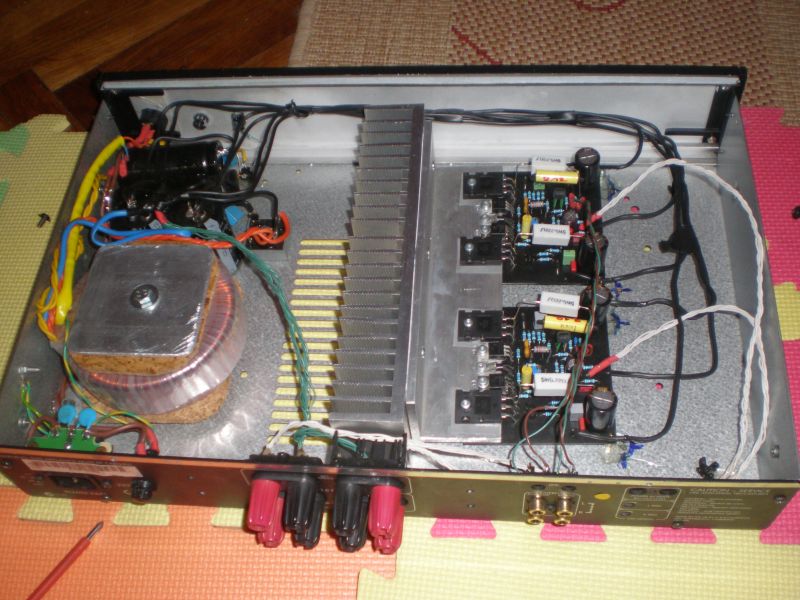 Iskoristio sam transformator i pločice pojačala, a ostalo otišlo u rashod. Stavio sam sve u kućište koje mi je ostalo od jednog projekta. Tu je ispravljač sa 4x10000 uF Cornell Dubillier , trafo 300VA. Za sada nisam stavio zaštitu za zvučnike. DC offset je zanemarivo mali, 5mV i 7mV. Promijenio sam neke komponente na samoj pločici, ali manje-više je odrađeno sa vulgaris elementima osim što su elektroliti fini Nichiconi. Kod druge verzije koju sam polako radio su u startu bolji dijelovi pa me baš zanima da li će biti razlike i u kojoj mjeri.