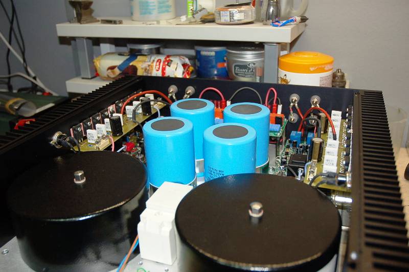 Sve se vidi, i diode i Vellemanovi kitovi. Mogao je posluziti i jedan zastitini kit za oba kanala. Vidim da su i diode s prednje strane od tog kita. Da li si plocice radio sam, ili si nabavio vec gotove. Cini mi se da su se hladnjaci mogli bolje iskoristiti da su tranzistori jos malo rasireni duz hladnjaka, ali ogranicenja su ovi veliki toroidi...