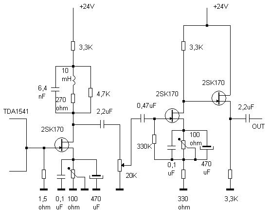 Shema doli prikazuje jedan od mogucih nacina upotribe 2SK170 sa TDA1541. Nije naravno sklopljena i "provjerena" ali to kod ovakvih jednostavnih sklopova koji ce prodelat iz prve ne znaci nista. Na njoj prvi 2SK170 prihvaca taj mali signal od 6mVp-p i pojacava ga nekih 60 puta. Taj dela bez source degeneracije jer mu sa obzirom na nivoe signala ni potribno povecavat linearnost. Ova ikebana u drainu predstavlja mrezu koja kompenzira onaj -3dB pad na 20kHZ. I mada izgleda kompleksno, ne triba je se plasit jer nece bit nikakvog motanja zavojnice (ta je 10mH iz Farnellove ponude).