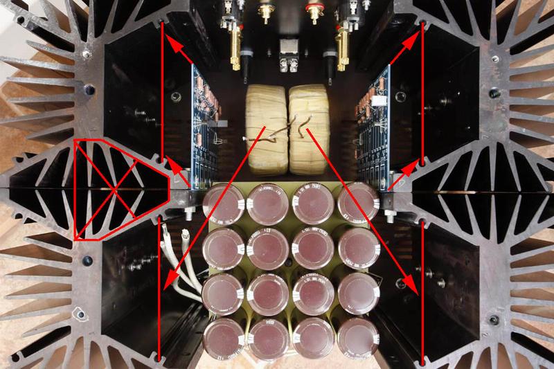 Za pocetak, provjeri moze li trafo i plocica s kondenzatorima stajati okomiti, pri tome trafo najblize prednjoj prloci ('na njoj'), Problem s razmjestajem je sto u startu trafo sprecava protok zraka za kondenzatore, a oni su tu najkriticnija komponenta kad se tice grijanja. Nadalje, trafo uvijek cim dalje od ulaza i elektronike, pogotovo za pojacalo u klasi A. Inace bi ga za tu kolicinu kondenzatora trebalo namotati na poseban nacin (s manjim iznosom maksimalne indukcije), no sto je, tu je, sad je gotovo.