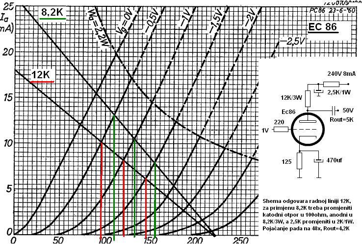 Unutar toga potreban je i pad napona od bar 140V( 2,82 x Veff) koji će dakle na ovom otporu biti ostvariv sa 8mA anodne struje.