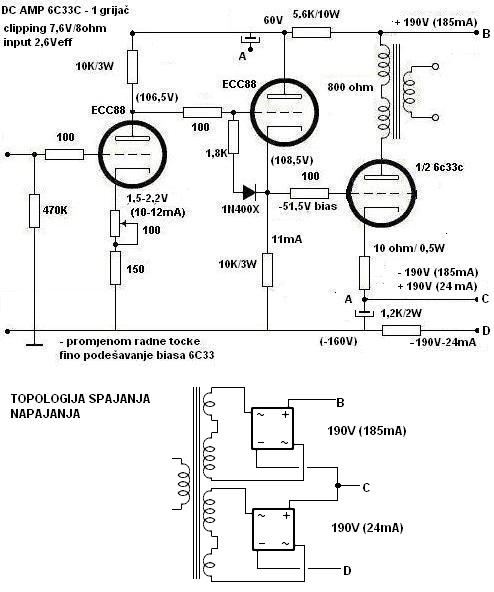 Evo kako bi to izgledalo u primjeru sa i bez DC veze. Bias izlazne lampe se u prvom slučaju (DC) podešava malom promjenom radne točke driverice jer se i tako mijenja pad napona kroz anodni otpor, a time i potencijal mrežice 6c33 prema masi. Zbog puno sporijeg zagrijavanja izlazne lampe od driverice, mrežica će se naći na nultom (ili približnom - ovisno o podešenju trimerom u katodi driverice) potencijalu prije nego poteče struja kroz izlaznu cijev.Sve dok se ulazna lampa ne postavi u radnu točku do tada je mrežica izlazne lampe pozitivnija od katode i vodimo je prema masi serijom otpora i diode. Ovaj 4,7K možemo smanjiti slobodno i na 2,2K. Čim poraste napon na katodnom otporu izlazne lampe, prestaje i funkcija tog spoja. Dakle, isključivo prevencija prelaznih pojava pri uključenju.