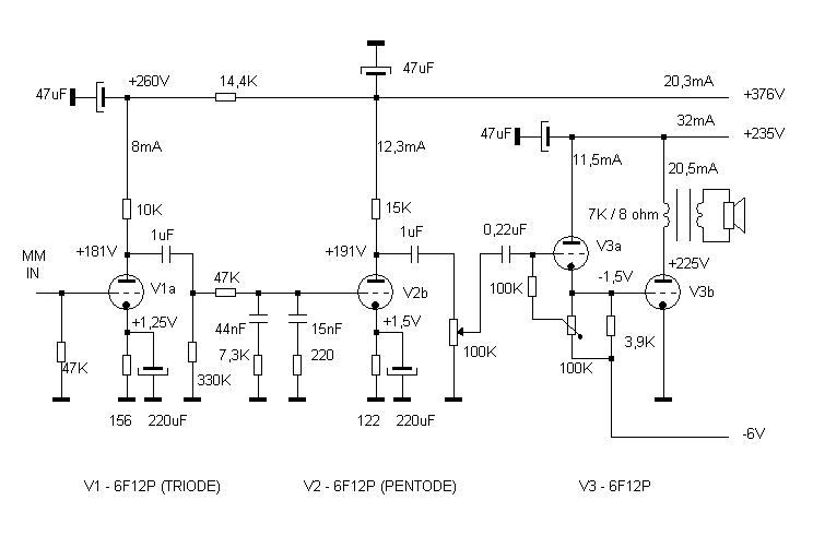 O samoj shemi se nima ca posebno rec, ogoljena je do maksimuma da bude cim jednostavnija tako da nima ni preklopnika phono / line. Neke nestandardne vridnosti komponenti se mogu zaokruzit na prvu standardnu vridnost i tu nece bit nikakvih problema. Tr i tako san vec navel odstupanja triodnog grafa i specificiranih parametara a triodne sekcije ionako rade na mistima di cak i prilicna odstupanja radne tocke nece puno znacit. Nije nemoguce da se moze pojavit neka manja razlika u pojacanju livog i desnog kanala ali to se lako korigira na anodnom otporniku ulaznog stupnja.