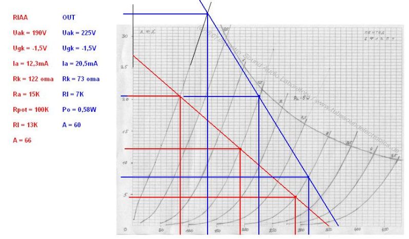 Evo da malo konkretiziram razmisljanja kako bi takav phono "integrirac" mogal izgledat. Prva slika je graf pentode u triodnom spoju koji vec sam po sebi pokazuje itekakav potencijal 6F12P. Crveno je ucrtano radno opterecenje od 13K za drugi RIAA stupanj a plavo za 7K (trafo od Simfinije :lol: ) za izlazni stupanj i lipo se vidi kolika linearnost se postize i da se sa zanemarivim izoblicenjima dobiva preko pol vata izlazne snage a to ce se u stvarnosti protegnut virovatno i na preko 1W jer ce drive sa sljedilom omogucit i ulazak u podrucje struje resetke.