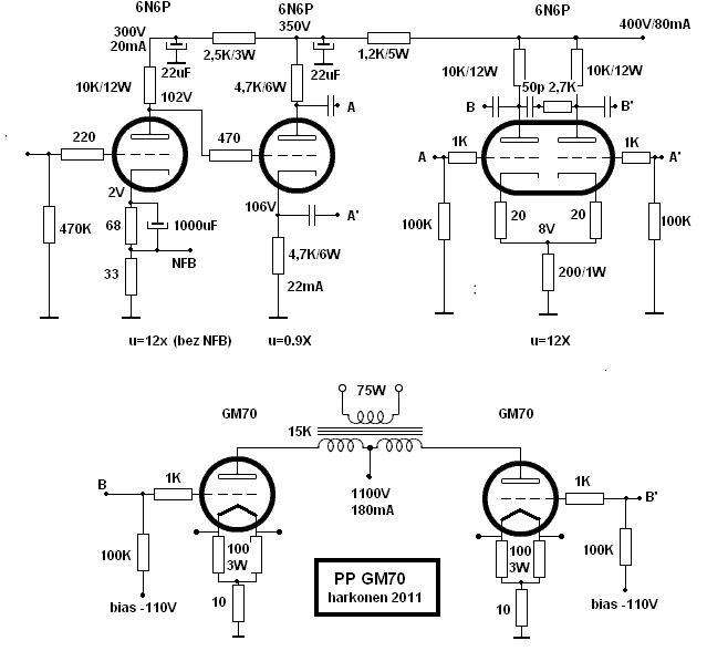 Koncertina spliter za dobru simetriju bez obzira na točno pojačanje i starenje lampe (upariti jedino 4,7K otpore), iza nje još jedan stupanj diferencijalnog pojačanja sa dovoljno malim izlaznim otporom da ne trebamo katodna sljedila prije GM70 ,a s kojem imamo i dodatno simetriranje te blagu eliminaciju ringinga (RC na anodama, točna vrijednost kapaciteta se utvrdi skopom), ukupno imamo i malo rezerve za par dB globalne povratne veze i prilično dobru osjetljivost . Bez gobalne povratne (ali i uz vrlo,vrlo dobro riješen trafo),