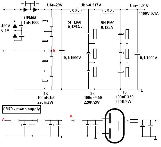 Napajanje za GM (i slične triode) možemo napraviti ovisno o načinu izvedbe, za mono ili integriranu verziju