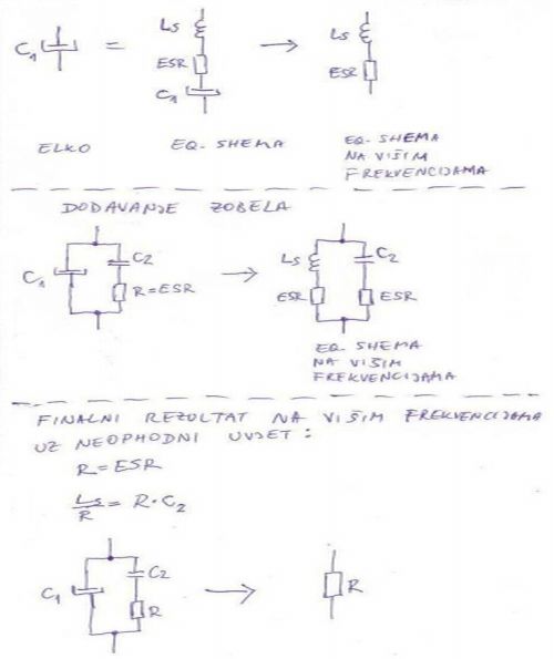 Na slikama su prikazane ekvivalentne sheme Zobel mreze i ca se sa njom dobiva ka rezultat. A dato je i ono malo matematike kako se Zobel ovdi racuna. Triba naravno znat (ili izmjerit) ESR i serijski induktivitet elka