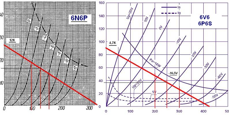 6v6 (6p6s) je u radnoj točki 250V/38mA sa 4,7K/15-17W teretom, a 6N6P je u radnoj 125V/16mA sa 12K/5W teretom.