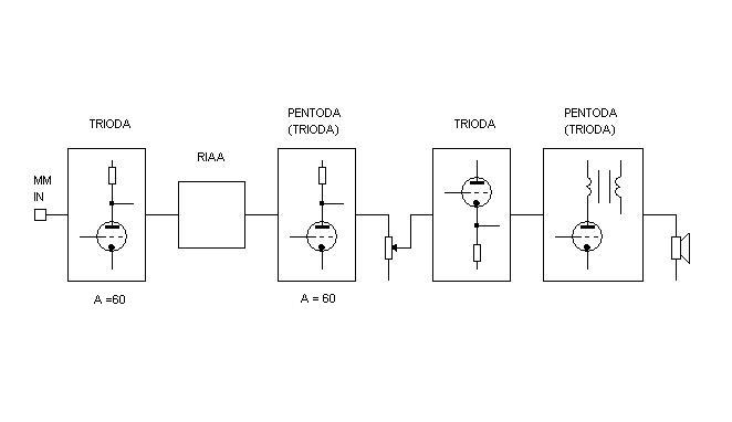 OK, znaci da iz jedne preostale 6F12P triba dobit dovoljno pojacanja da se moze postic nekih 3mV ulazne ositljivosti i da se pokriju gubici u pasivnoj RIAA mrezi. Malo brzinskog saranja po grafovima pokazuje da ona to moze. U praksi su ostvariva pojacanja i od vise od 70 puta ali ajmo uzet da smo i za triodni i za pentodnu (triodno vezanu) sekciju postavili pojacanja od 60 puta. Sa potribnih 1,1Veff koje tribamo dobit i sa uracunatim gubicima u RIAA filteru od 20dB (10 puta), dobijamo upravo tih 3mV zeljene ulazne ositljivosti.