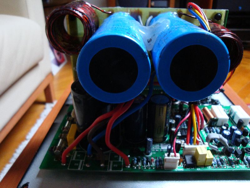 Subwoofer je solidan, s ponekim "kineskim" biserima. Otpornik koji povezuje pločicu i uzemljenje je bio takve vrijednosti da nije služio ničemu, odnosno uzemljenja nije ni bilo. To je napravljeno iz razloga da što manje bruji, a što je opet posljedica loše ispravljenog napona (premali kondezatori). Naravno, dodana je pločica sa 2 x 10000 uF/100V i zavojnice tako da je sa postojećim kondezatorima formiran CLC filter.Zavojnice su motane ručno pa zato tako grbavo izledaju. Žice sam imao, a volje taman toliko kako izgledaju. Za ovaj dio napravio sam i novi PCB, a sve je taman stalo u predviđeni prostor subwoofera. Dio napajanja za opampove je također doživio promjenu zamjenom kondezatora sa Panasonic FC-om mnogo veće vrijednosti. Ne sjećam se više što je bilo, ali recimo sada je reda veličine 5 puta više. 3300 uF.