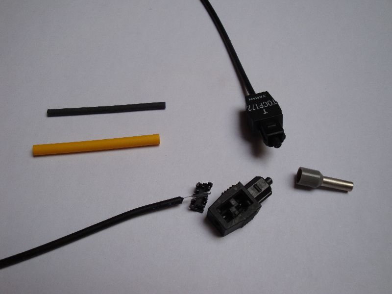 I naravno kakav bih ja bio samograditelj da ne mogu riješiti ovaj trivijalan problem. Potreban pribor; standardni toslink kabel, skalper, termobužir, tuljak za kabel i pet minuta dobre volje.