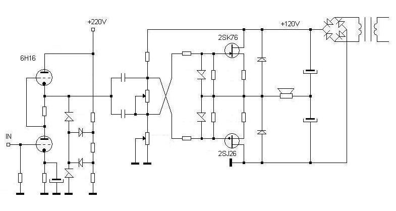 A kako zbog objektivnih razloga (nemogucnosti nabave :lol: :lol: ) dosad ni bilo moguce stec neka prakticna iskustva sa njima onda vec ovih dana krece u prakticnu provjeru jedan sklop sa njima. Kako je bepone izrazil zelju (i upornost :lol: ) da ih primini u gitarskom ampu onda je tu doli jedna shemica izlaznog dila gitarskog ampa koji bi tribal bit u stanju postic do skoro 80W. Na shemi nisu (zasad) prikazane vridnosti komponenti jer ce lako moguce neke tribat eksperimentalno definirat a to ce ponajvise ovisit o tome kako ce se u praksi pokazat stabilnost mirne struje. Na ovoj shemi ima nekih detalja koji mogu nekoga zbunit a to su u prvom redu sve one diode i njima pripadajuci otpornici oko cijevi. Ti detalji sluze da osiguraju da na gate Vfeta ne dodju ni u kojem slucaju veci naponski nivoi nego ca on moze podnit. O detaljima sheme ce bit vise rici u kasnijim postovima.