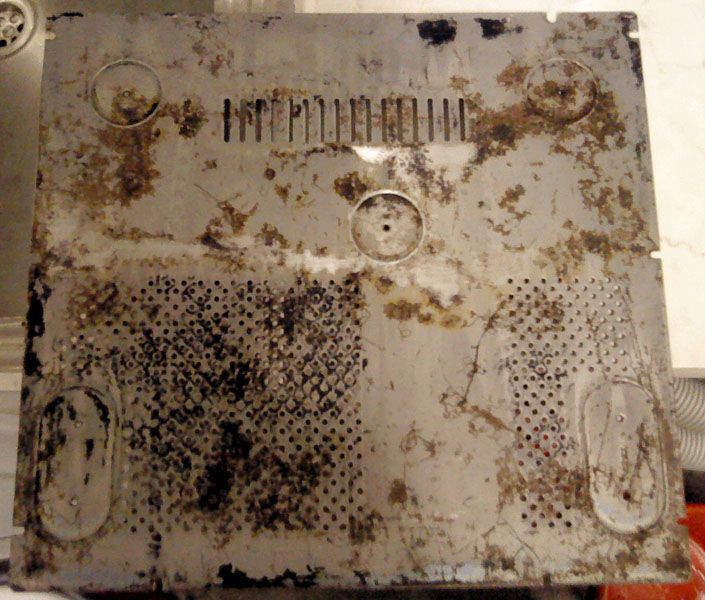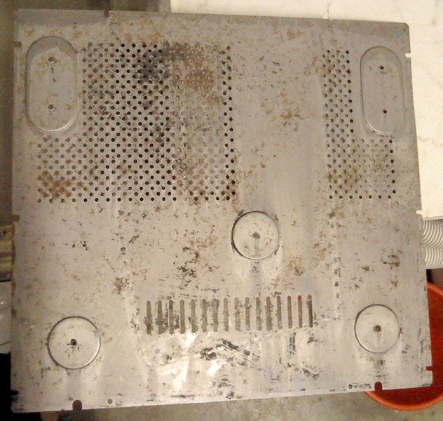 S donje strane se poznaju tragovi gdje je uredjaj ispod gorio, tu je kemija odradilo svoje ispod boje. S strane koja ide prema unutrasnjosti uredjaja situacija je puno bolja ali ovdje je pak bila kisela atmosfera od venting-a elektrolita. Ovo ce potrajati, no nema zurbe, donja ploca ide na uderjaj zadnja. Polako slijedi rotaciona cetka, pa temelj, pa lak... svaki dan po malo, a dok se susi, radim na Luxmanu :)