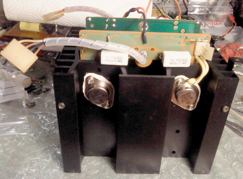 Nakon sto su hladila nakon ponovnog eloksiranja izgledom kao nova, ociscene su plocice koje dodju na njih. Nisam to uslikao, ali za to j epotrebno podnozja za TO-3 tranzistore skinuti s ploce, odstraniti dotrajalu ljepljivu traku koju su stavili izmedju njih i ploce da se prilikom strojnog lemljenja ne zaleme kontakti, podnozja temeljito odmastiti, oprati u kadici, i sve skupa ponovno zalemiti. Uz to su zamijenjeni i originalni serijski otpori u bazama. Ovdje umjesto originalnih 'fusible resistors' stavljam kvalitetniji metal-film. Naime, fusible-i se vole rastaliti 'do pola' nakon cega slijede razne cudne pojave, mjerenjem se obicno vidi povecan otpor. Njihova je uloga ionako da po mogucnosti zastite dijelove na driver ploci, iako se ta 'zastita' zapravo prvenstveno odnosi na sacuvanje vodova na ploci - moglo bi se reci, neka vrsta zastite od pozara. Danasnji metal-film otpori mogu sasvim dobro zamijeniti starije tipove osiguraca-otpora, koristeni su zato jer se za razliku od karbon-film otpora ne mogu zapaliti. Moderni metal-film otpori su na isti nacin samogasivi, i odlaze u prekid bez gorenja. Buduci da je pojacalo u meni datom stanju imalo mjesavinu svakojakih tranzistora, bilo je za pretpostaviti da su mijenjani vise puta, a i mjerenje originalnih serijskih otpora j epokazalo da neki odstupaju u vrijednosti. Zato su svi zamijenjeni. Za divno cudo, svi emiterski otpori su i dalje originalni, i tocnih vrijednosti!