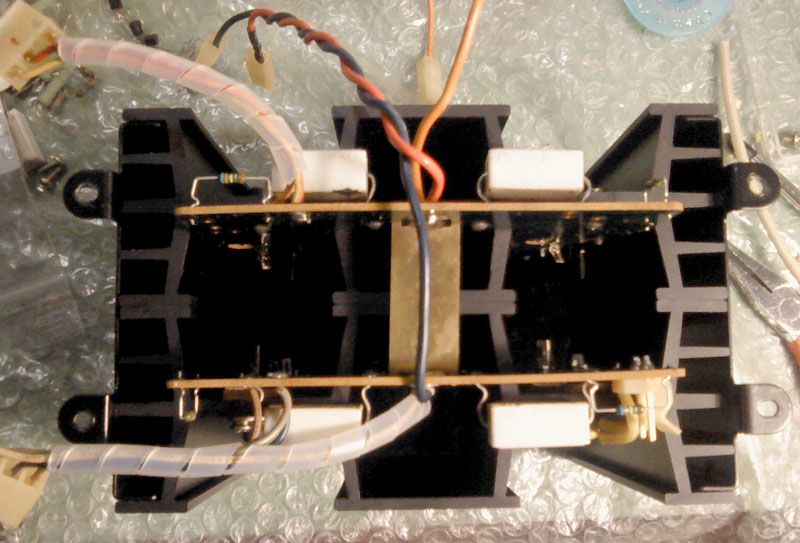 Iako izgleda kao da je puno posla, revizija ploce pomocnog ispravljaca, zastite i soft-start-a nije prevelik zalogaj. Svodi se na zamjenu svih elektrolita, temeljito ciscenje releja, te prelemljivanje i ciscenje cijele ploce. I ovdje je trebalo pazljivo provjeriti sve dijelove zicane forme, srecom, donja ploca vecim dijelom zatvara prostor gdje se nalazi ova plocica, tako da nije trebalo raditi nikakve zahvate na zicanoj formi.