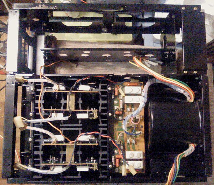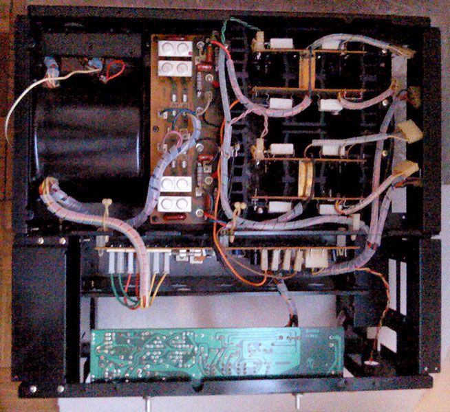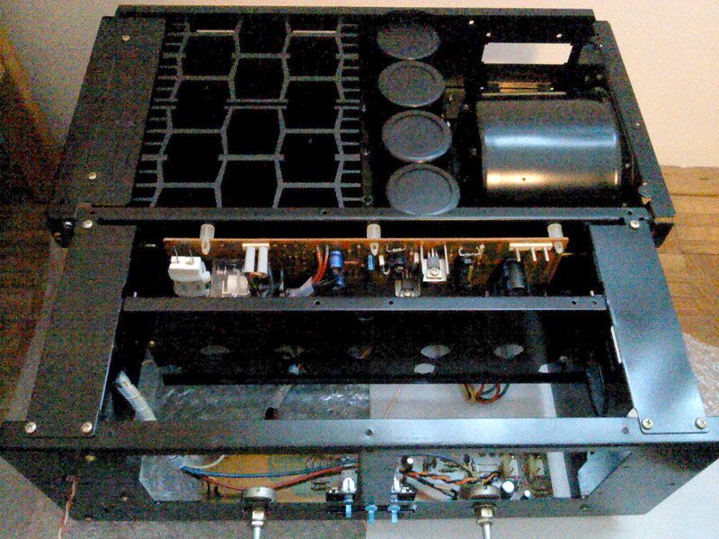 Ovdje jos nedostaje ozicenje prema konektoru za zvucnike i ozicenje mreznog napajanja. I jedno i drugo je bilo poprilicno izmesareno u originalu i manje-vise ce biti posve zamijenjeno novim zicama. No, odozgora sve skupa vec poprima formu kompletiranog pojacala - na prednjoj ploci nedostaju samo PP-metri i prekidac napajanja, a driver ploca, cija ce revizija biti najkompliciranija, se iz ovog kuta ionako ne vidi pod svojim poklopcem... aktualno stanje gledano odozgo: