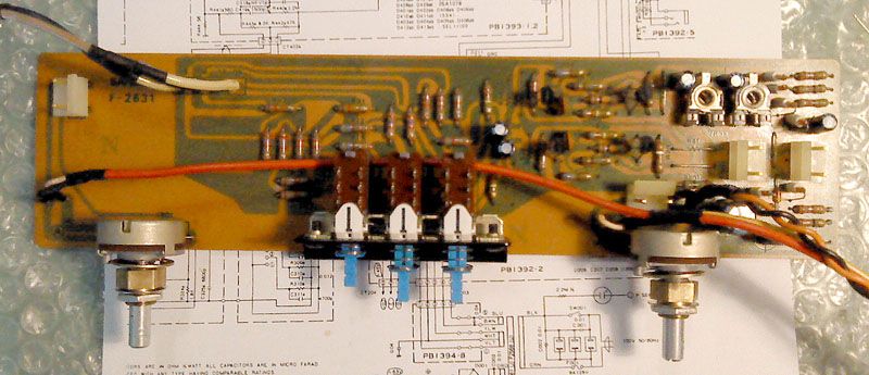 Na ovoj ploci je bilo nekakvog krpanja, radi cega je trebalo obnoviti dijelove zicane forme. Jedan dio je na neki nacin stradao slicno kao i zice na izlaznim modulima - dio izolacije izgleda kao da je izgrizen. Uz to, potenziometri, prekidaci, spojna mjesta zica i svi konektori su naknadno rucno lemljeni, i to jako lose. Ploca je zato kompletno prelemljena, naravno nakon obaveznog ciscenja.