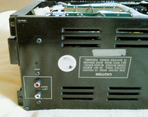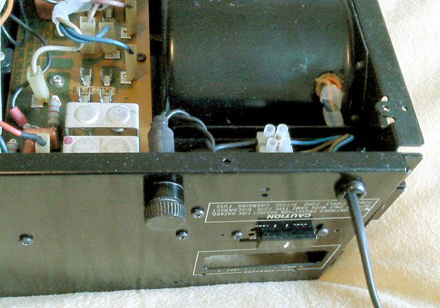 Mrezni ulaz je takodjer kompletan. Razbijeni nosac osiguraca je nadomjesten novim, a nov je i mrezni kabel s uvodnicom. Netko ce sad tu protestirati radi debljine kable, stavljen je onakav kakav je bio i u originalu! Uz to ide i nova zicana forma koja se iz ovog kuta ne vidi, malo modificirana za slucaj da se nesto treba rastavljati - sad se to moze bez lemila.