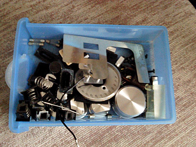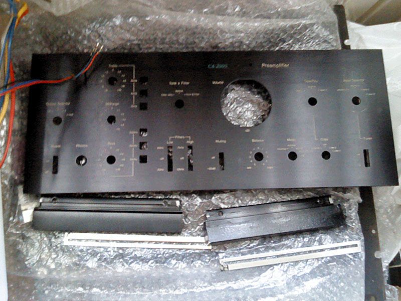 I na kraju prednja ploca, ogoljena od svih dodataka tipa plasticni inserti, nosaci LED, umetak s skalom za potenciometar, itd itd, i jos k tome rastavljena na dijelove - bocnice, ukrasni okviri, i maska. Sve skupa je prirpema za skidanje stare boje iz gravure, skidanje kojekakvih nafarbanih dodataka da bi se prikrile ogrebotine, skidanje eloksaze, te popravak, brusenje i na kraju nova eloksaza, popuna gravure i sastavljanje:
